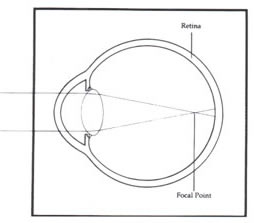 Hyperopia is caused when the eye is too short from front to back, or when there is a weakness in the focusing power of the lens or cornea. The focal point of parallel lines in a farsighted person is behind the retina.